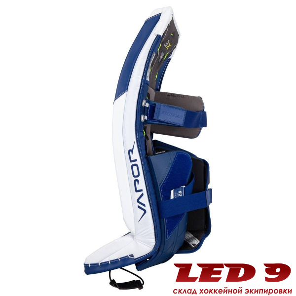 Щитки вратарские BAUER VAPOR 3X модель полупрофессионального уровня, новинка сезона 2021 года. Применение новейших, фирменных технологий при производстве щитков этой модели позволило снизить их вес, сделать их хорошо сбалансированными, обеспечивающими высокий уровень защиты. Материалом внешней отделки является высокопрочный материал COR Tech, который способствует снижению веса щитков и дает вратарю возможность эффективнее контролировать отскок шайбы. Этот материал представляет собой очень прочную кожу, которая помогает обеспечивать превосходное скольжение и общую долговечность. Гибкий, зауженный сердечник, сужаемый с внешней стороны и образующий зауженный профиль щитков, способствует сохранению максимальной площади опоры и обеспечивает оптимальную гибкость, гарантируя оптимальное скольжение и отличное сцепление со льдом. Вставка из композитного материала Curv внутри щитка в районе бедра обеспечивает лучшее прилегание, эффективную и легкую защиту. Коленный блок Stabiliflex создан для формирования невероятно стабильной площадки при переходе в позицию «бабочка», но он будет «сгибаться» вместе со щитком, чтобы не мешать общей гибкости конструкции. Ниже на икре, на внутренней стороне канала для ног, расположен элемент Balance Plate Calf Pillow, который создает гораздо более надежную зону приземления, и который дает вратарю совершенно новый уровень комфорта при использовании этого элемента. Щитки имеют мягкий канал для ноги. В канале для ноги используется внутренняя подкладка, выполненная из износостойкого материала, который быстро сохнет и создает комфортное состояние для ног на протяжении всей игры. Удобная и надежная система крепления Tune Fit создает комфортную посадку щитка и оптимальный баланс